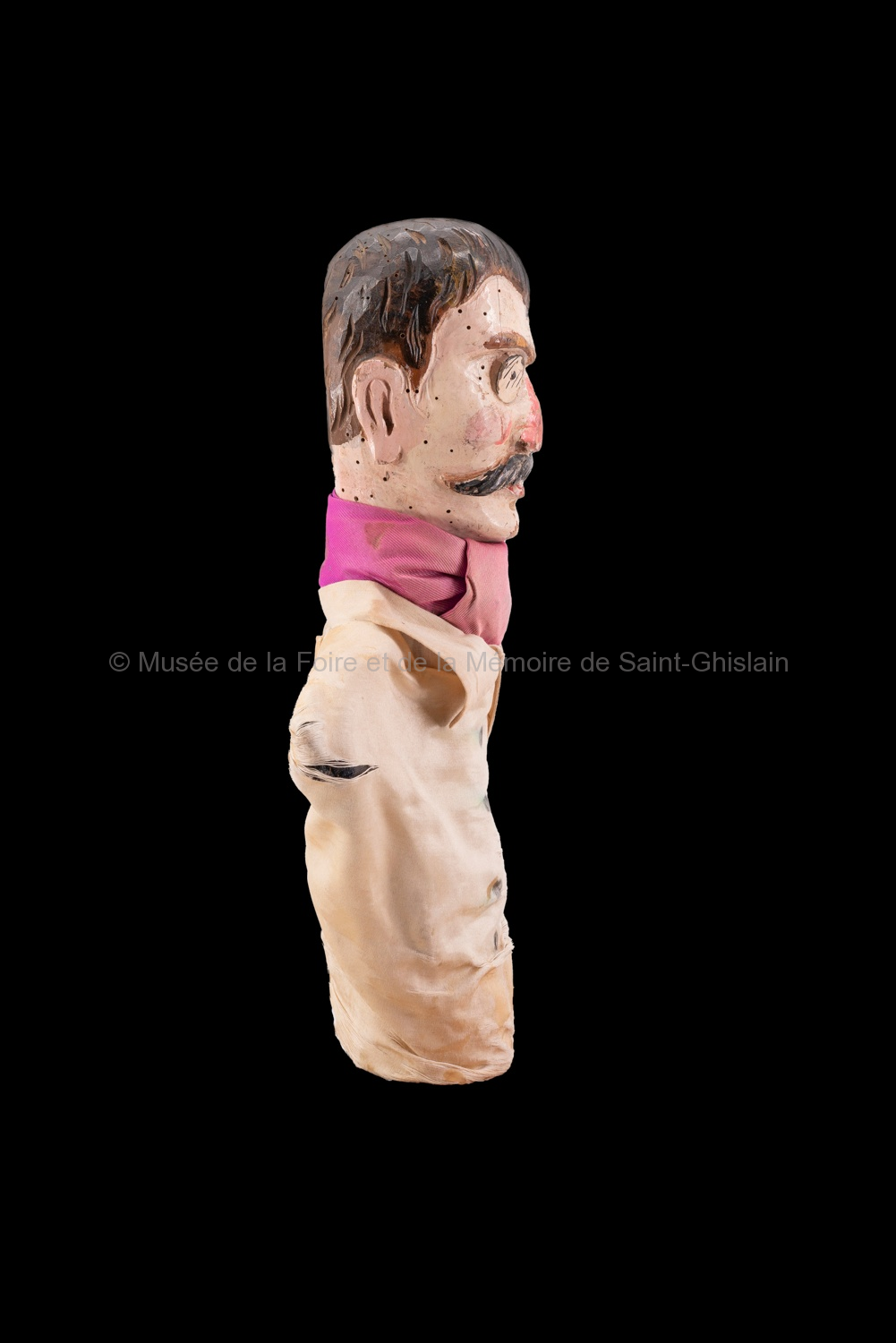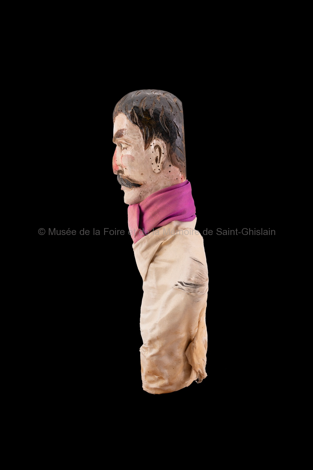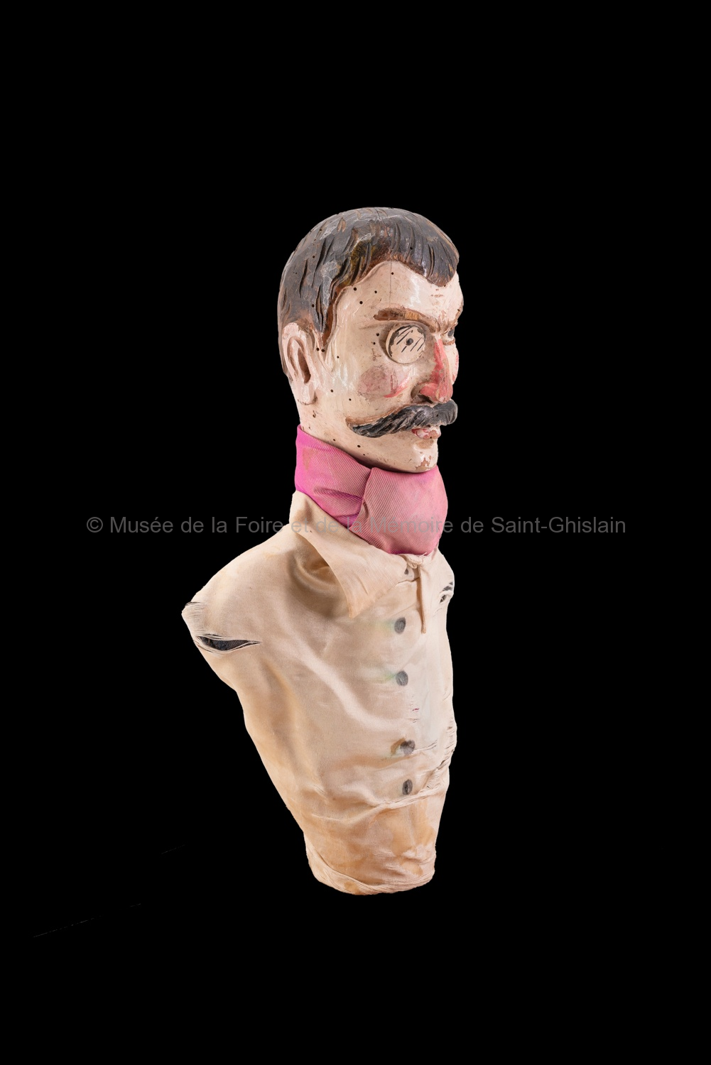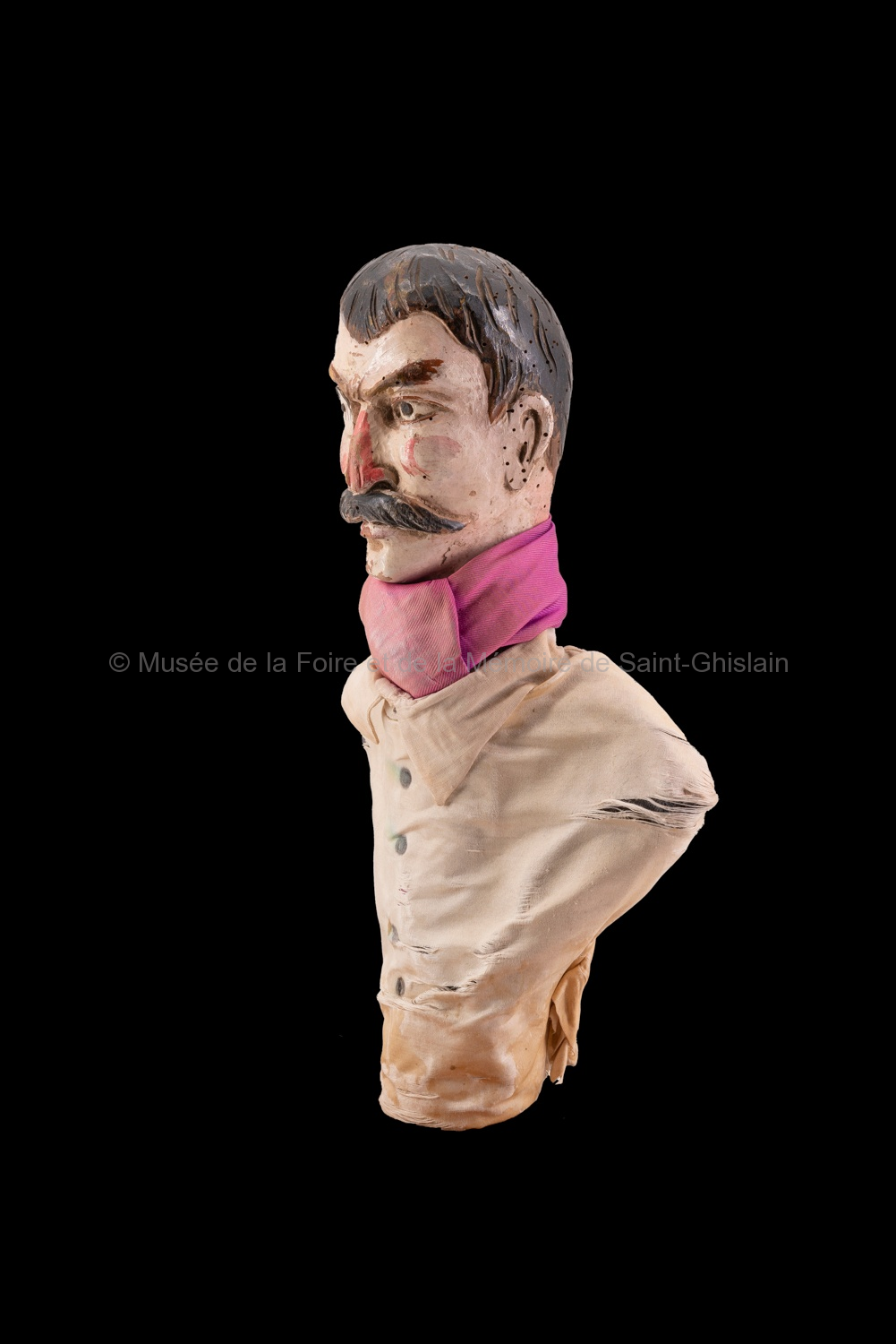 Objet faisant partie d'un jeu de massacre Bois taillé et polychromé, tissu. Dimensions : 38 L x 19 P x 9 H cm