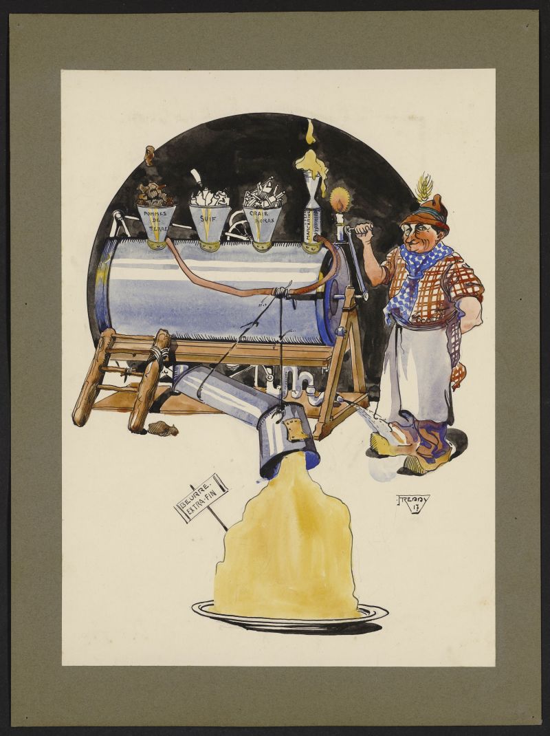 Né et décédé à Bruxelles (1861 – 1920), Eugène Keym, est un personnage de la vie culturelle bruxelloise. Echevin à Watermael au déclenchement de la guerre, il remplace le bourgmestre arrêté par les Allemands. Il résistera et sera aussi arrêté à plusieurs reprises. Il s’investit dans des œuvres philanthropiques comme le Comité national de Secours et d’Alimentation ou encore l’œuvre nationale des Orphelins de Guerre. En plus de ces actions patriotiques, il collecte méthodiquement pendant toute la guerre des souvenirs, tant objets que caricatures. Cette collection est un témoignage unique sur la vie de Bruxelles occupée. Dès la libération de la ville, ces caricatures sont présentées au « Salon Anti Boche » ouvert du 3 au 21 décembre 1918. La collection comporte des caricatures, en général originales, et en parfait état de conservation. Elles abordent des sujets diversifiés : l’ennemi, les atrocités allemandes, le rôle des Alliés, la question flamande. Les caricatures les plus nombreuses sont celles qui décrivent la vie quotidienne des Bruxellois avec le passage à l’heure allemande, le couvre- feu, les réquisitions, les difficultés d’approvisionnement, le manque de charbon, les traficotages de la nourriture, l’enrichissement des campagnes, etc. Maurice Keym, fils d’Eugène, a fait don de la collection aux Archives de la Ville de Bruxelles en 1929.