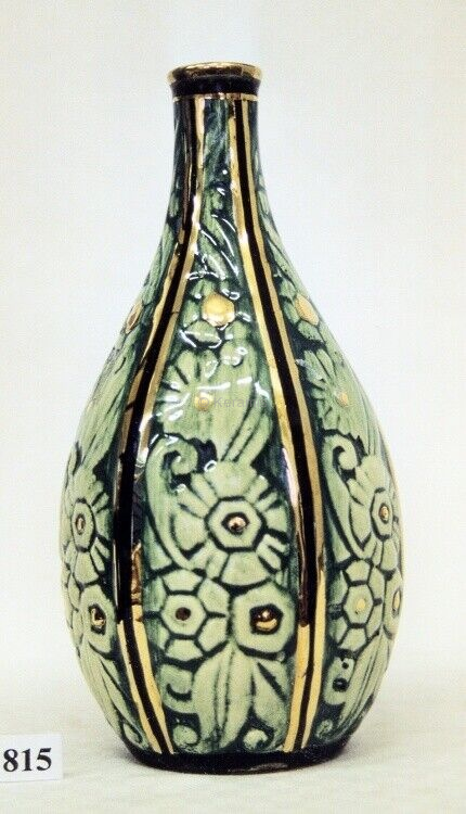 Vase piriforme. Dimensions : Diamètre de la base en cm : 6,5 ; Diamètre du col en cm : 3 ; Hauteur en cm : 22. Matériaux et techniques : Eléments en reliefs, émaillage et dorure. |