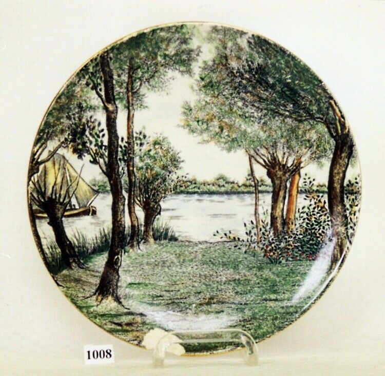 Assiette polychrome orné d'un paysage en bordure de fleuve Dimensions : Diamètre en cm 25,3 Largeur en cm 2,6 Matériaux et techniques : Impression (gravure) et rehauts de peinture |