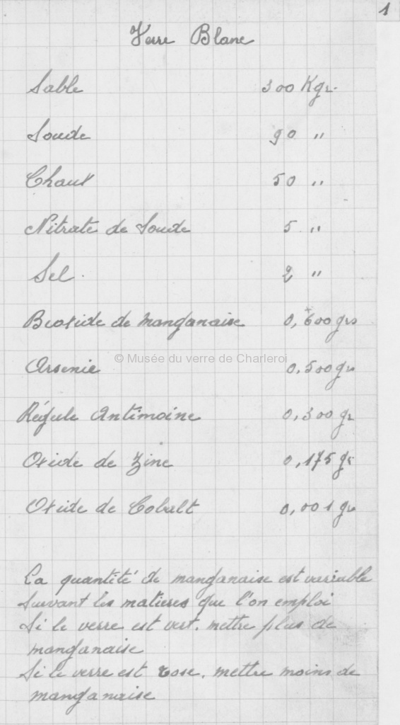 Première page du carnet intitulé Composition des verres: verre blanc. Document de 94 pages. Format : 19 cm. |