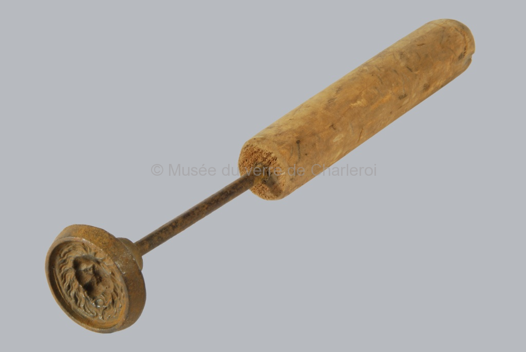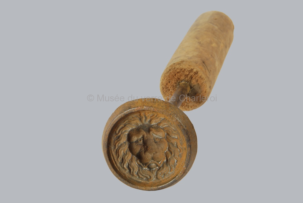 Outil avec inscription. Motif tête de lion. Havré. Verreries et gobeleteries Doyen. Dimensions : longueur 30 cm, diamètre 5 cm