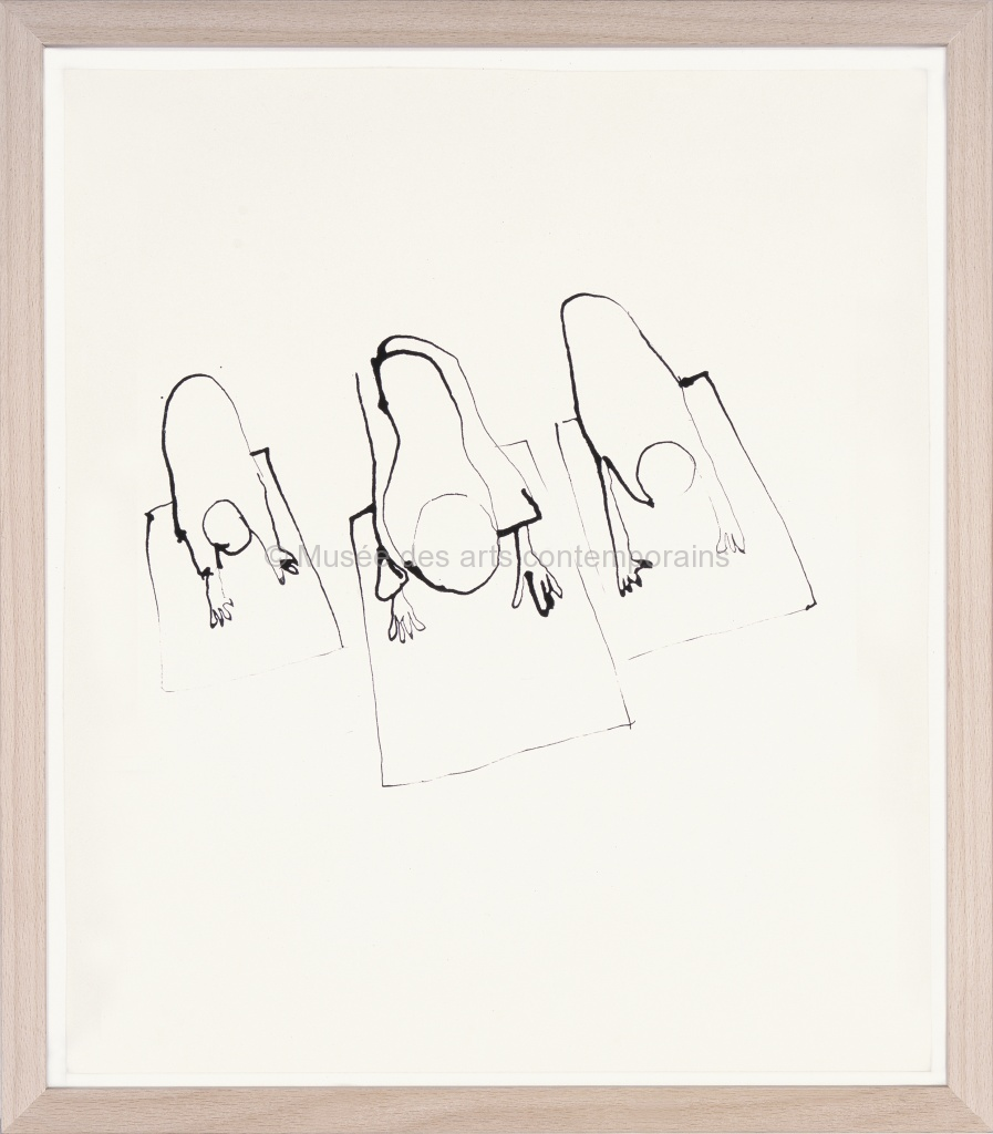 Fait partie d'une série de 5 dessins dissociables. 3 personnages prosternés. Dimensions : 38 x 33 cm. Avec encadrement : 42,5 x 37,2 cm Matériaux et techniques : Encre sur papier |