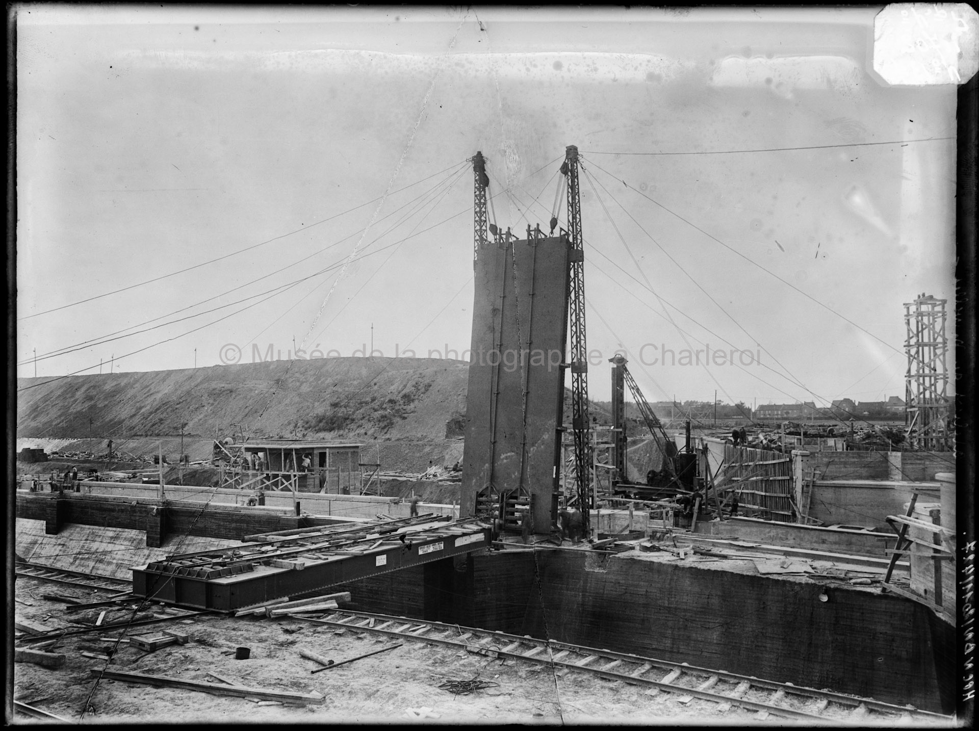 Ouvriers travaillant sur un pont d'écluse en construction. Négatif sur verre. Dimensions : 17,7 x 23 cm (Le support analogique numérisé est un négatif, il est affiché ici en positif.) |