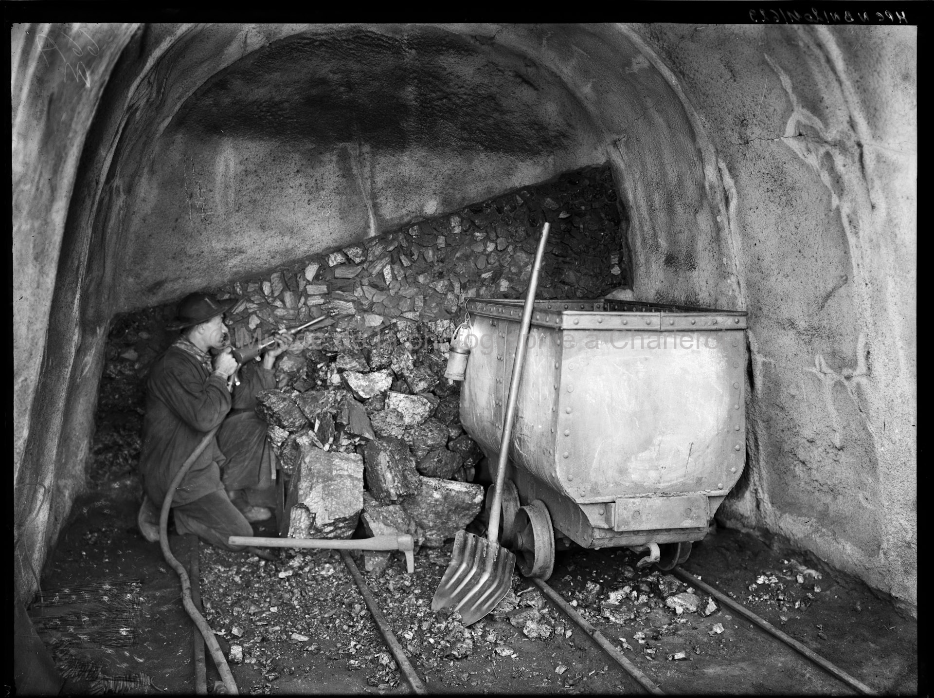 Mineur travaillant avec un marteau-piqueur dans la mine. Négatif sur verre. Dimensions : 17,4 x 23,3 cm (Le support analogique numérisé est un négatif, il est affiché ici en positif.) |
