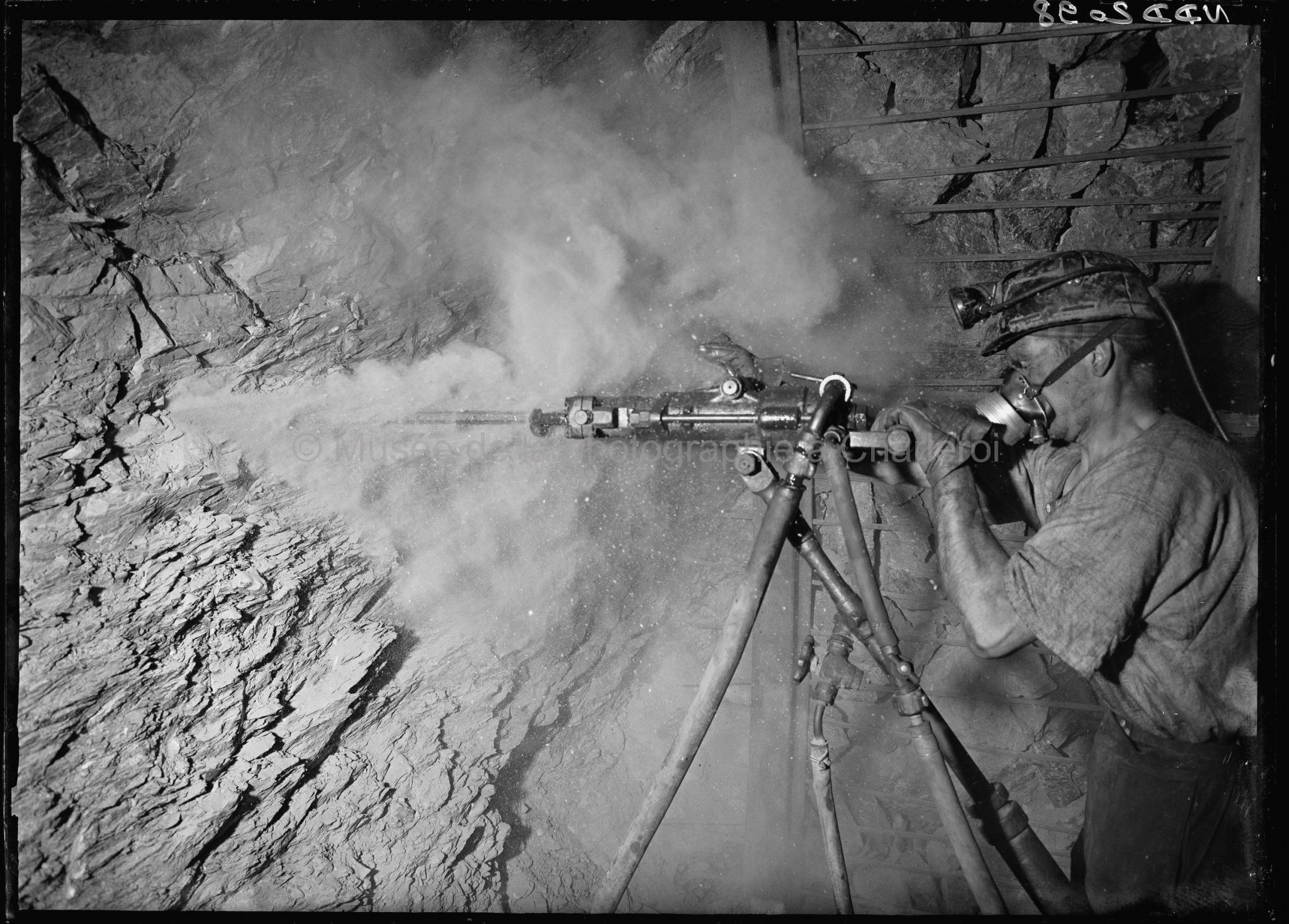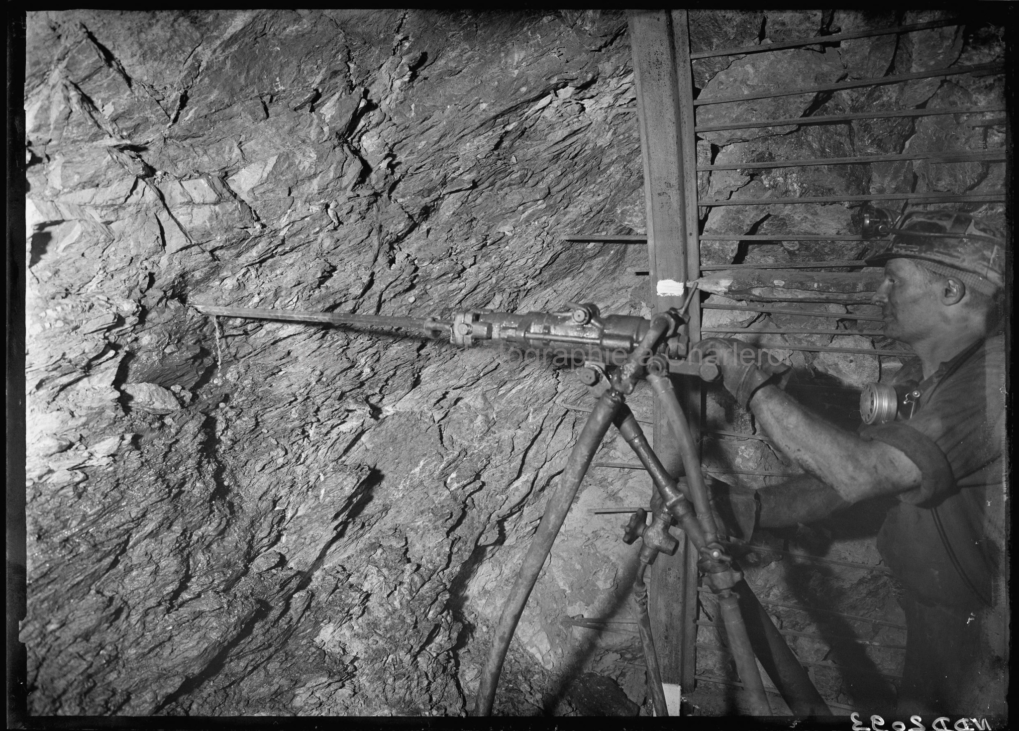 Négatifs sur verre au gélatino-bromure d’argent. (Le support analogique numérisé est un négatif, il est affiché ici en positif). 02 mars 1956. Charbonnage de Monceau-Fontaine, siège n°17, fond étage 903 Dimensions photos : 11,5 x 15,8 cm