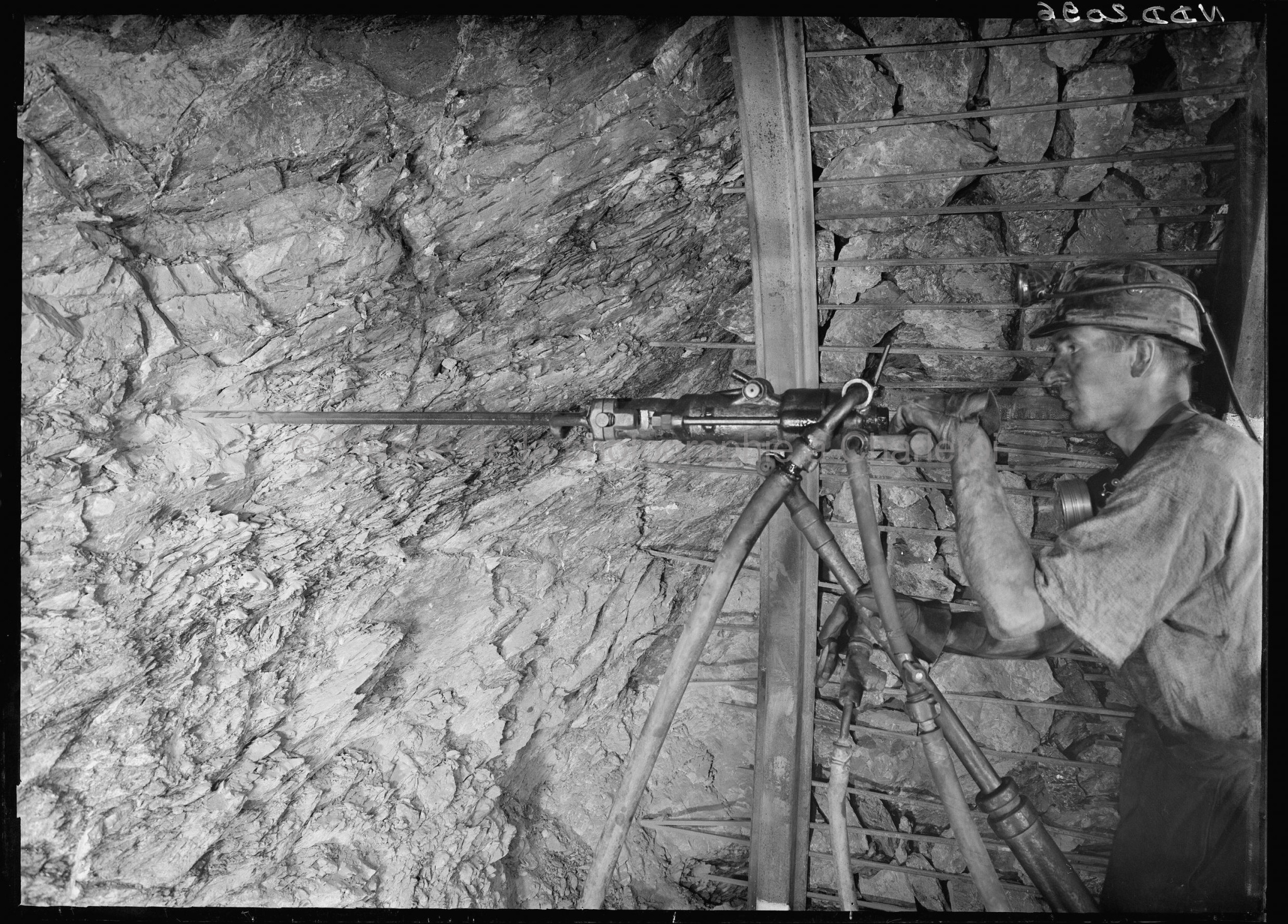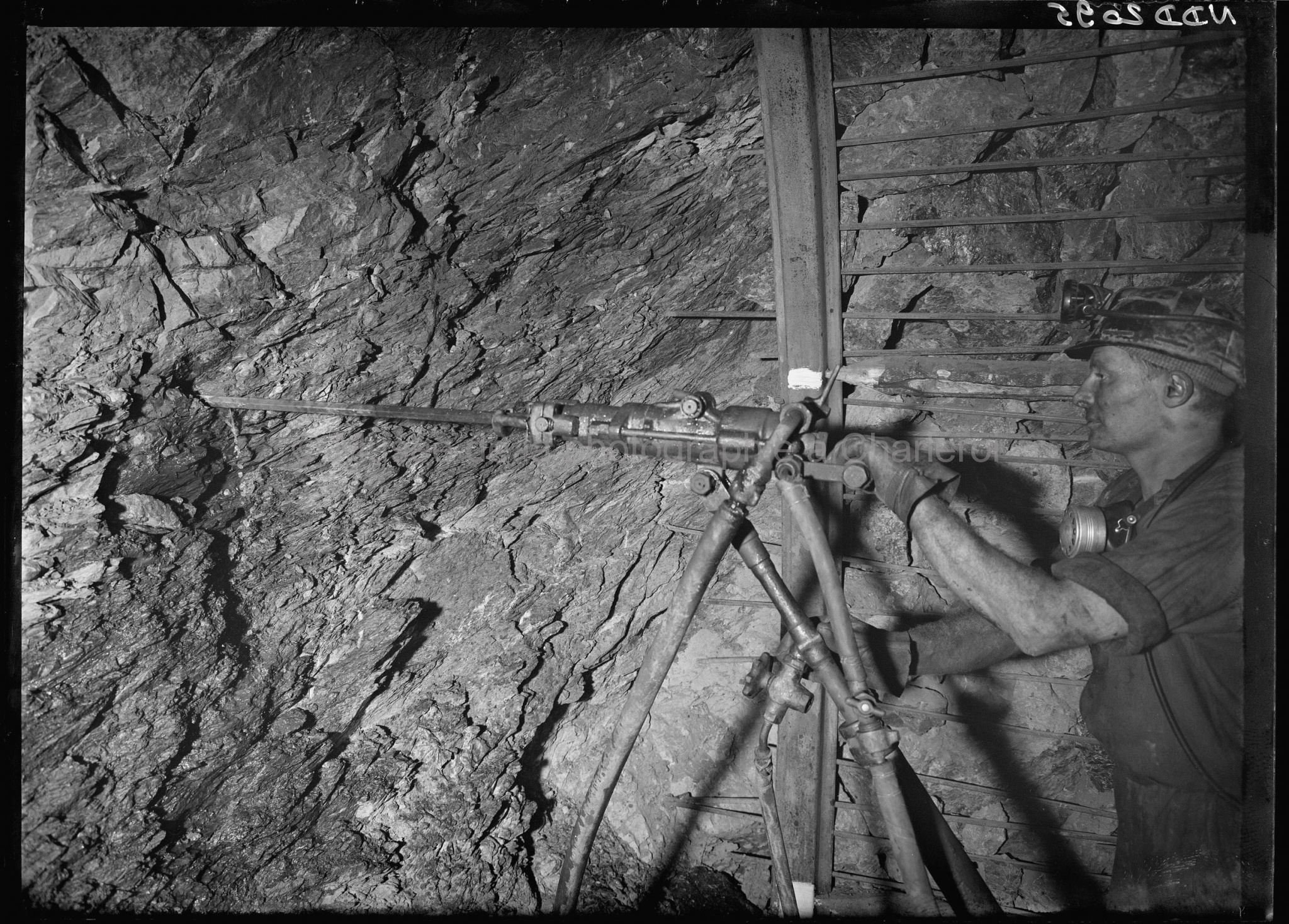 Foration des fourneaux de mines avec marteau-perforateur à injection d'eau, monté sur béquille, bouveau sud |