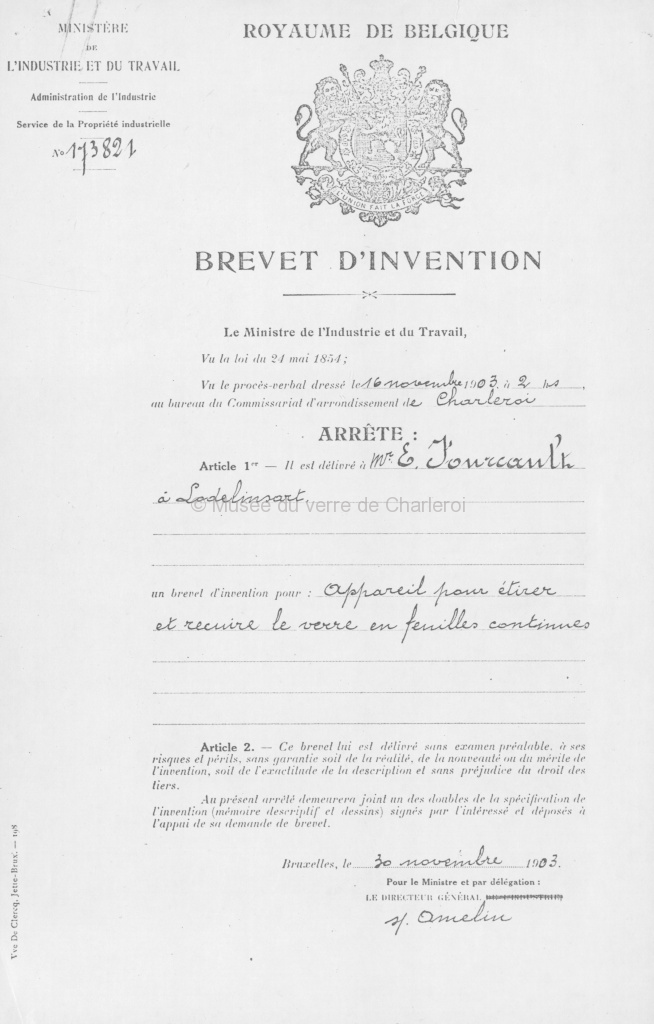 Brevet d'invention décerné à Émile Fourcault : appareil pour étirer et recuire le verre en feuilles continues. Date : 30 novembre 1903. Format : 36 cm |