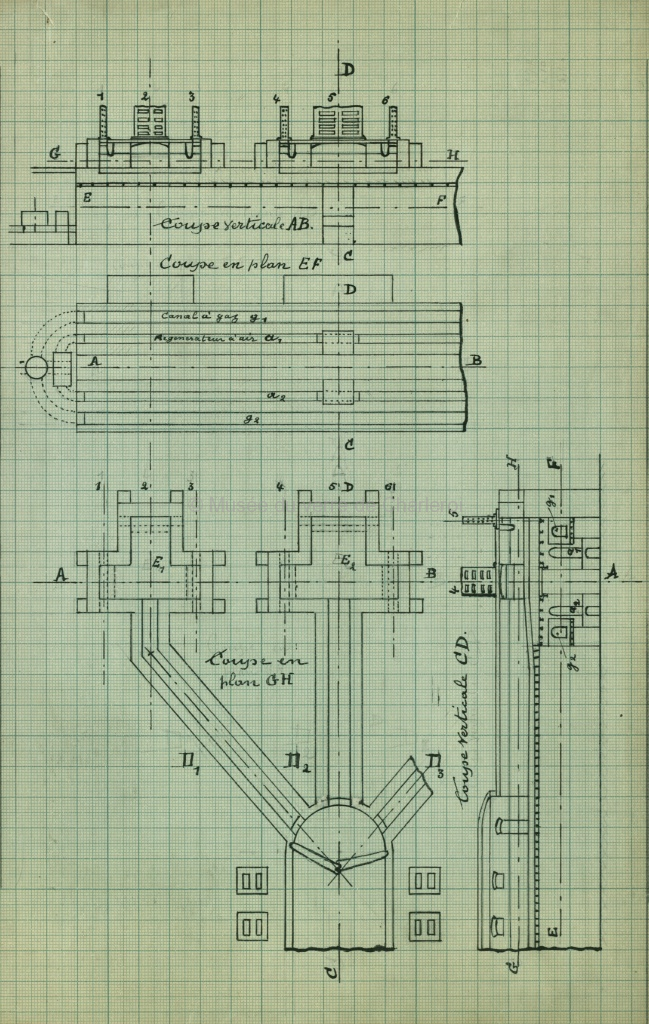 Ancienne disposition des bassins d'étirage du verre en feuille et différentes coupes verticales et en plans de la machine Fourcault. Croquis. J. Ledent. Document de deux pages. Format : 36 cm.