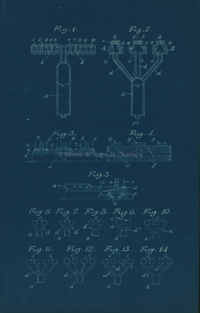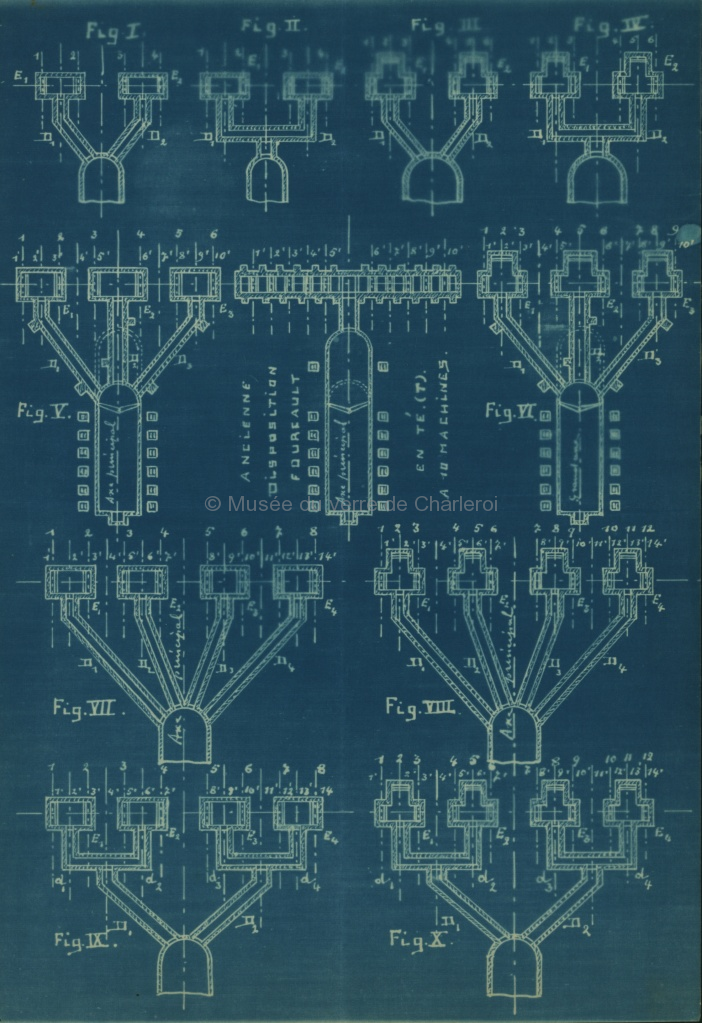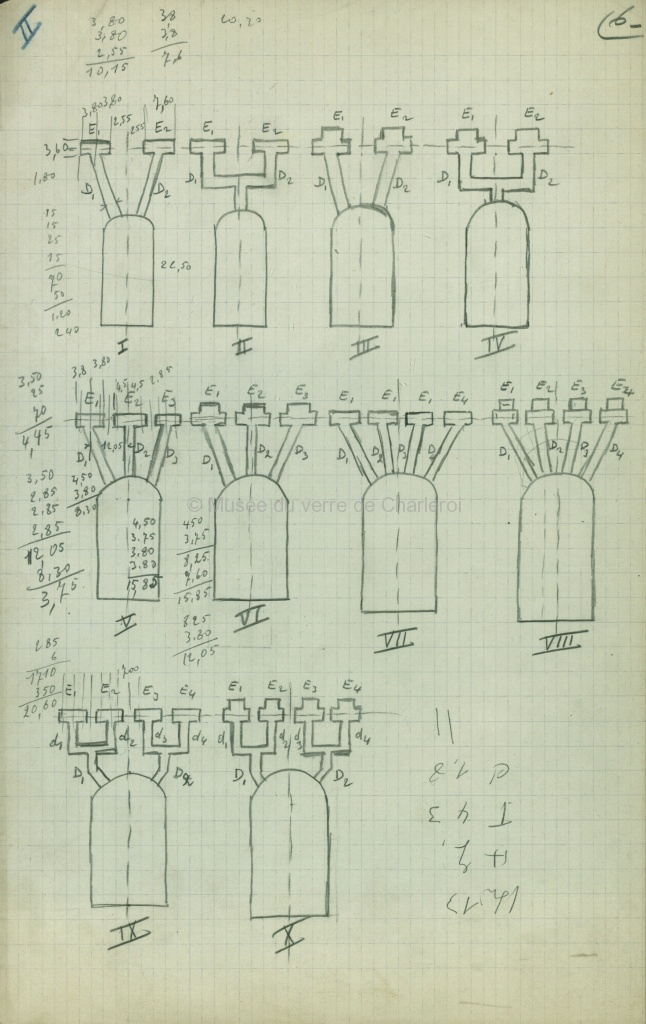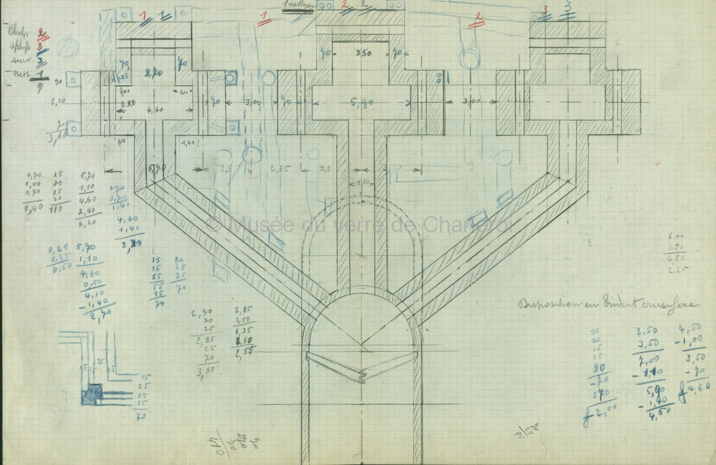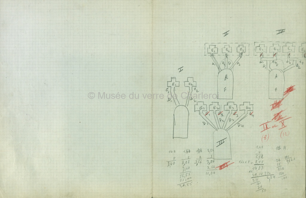 Plan bleu et brouillons, disposition Fourcault. Croquis Verreries. Croquis. J. Ledent. Document de cinq pages.