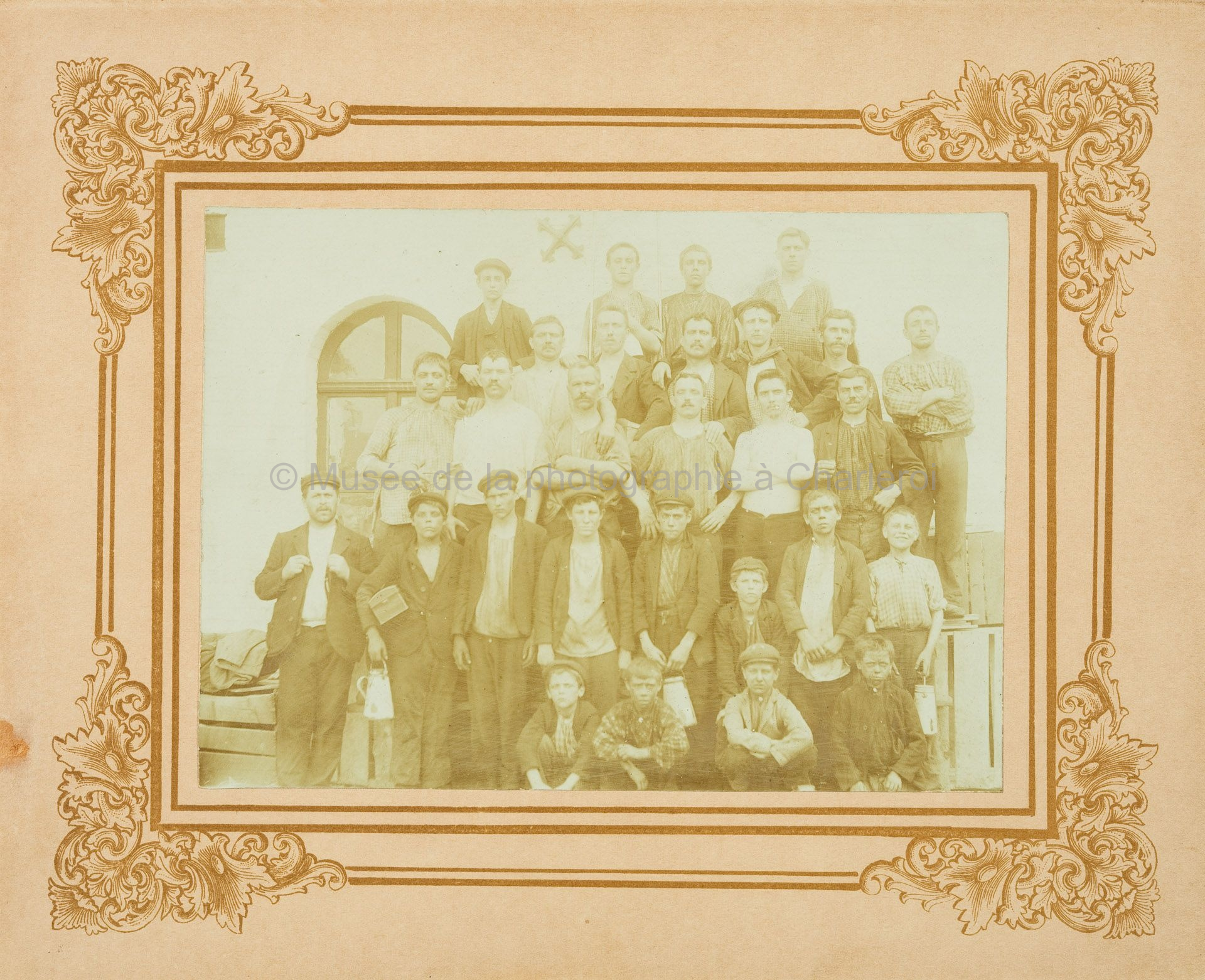 Portrait de groupe d'ouvriers adultes et enfants probablement d'une verrerie de Manage. Voir ciseaux dans la main de l'ouvrier à gauche devant la fenêtre. Deux cannes de souffleur en haut au centre. Dimensions : 12,2 x 17 cm |