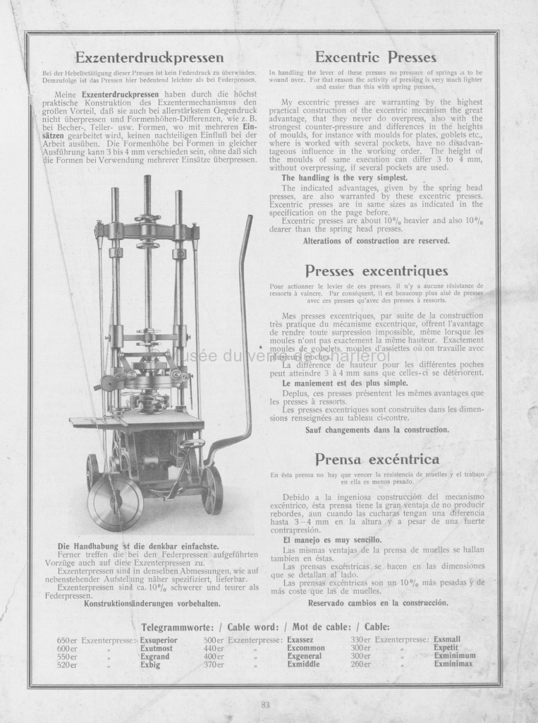 Catalogue, page 83. Document descriptif des presses excentriques en allemand, anglais, français et espagnol. Format : 29 cm |
